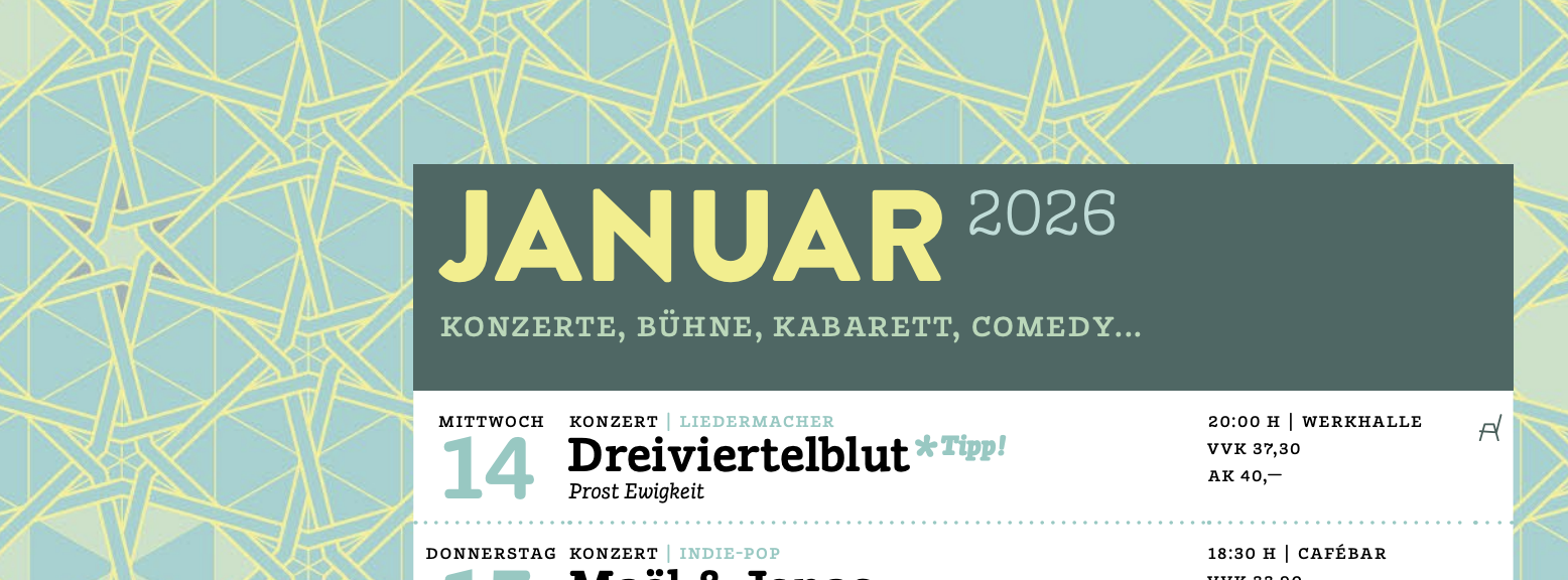 Veranstaltungen besuchen und sparen! Mit dem ROXY-Pass sammelst du bei jeder besuchten Veranstaltung einen Punkt. Ist der Pass voll, erhältst du 1x freien Eintritt für eine Veranstaltung deiner Wahl. Deinen vollen ROXY-Pass kannst du jederzeit am TicketService gegen eine Freikarte austauschen.