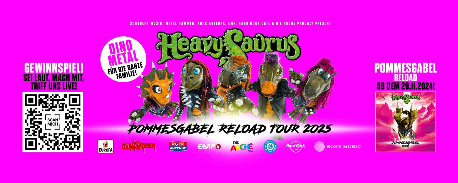 Weil alle – ob Mensch, Dino oder Drache – so viel Spaß dabei haben, wird die „POMMESGABEL TOUR" verlängert: Gleich im Januar 2025 geht es weiter für HEAVYSAURUS (und die fünf Profimusiker, die in den coolen Dino-Kostümen stecken und live spielen). Die 3- bis 11-Jährigen und ihre Begleiter jeden Alters können sich auf ein einzigartiges Konzerterlebnis freuen: Eine Band mit richtigen Instrumenten auf großer Bühne, mit Lichtspektakel, Nebel, Funkenregen, Luftballons und Konfetti. Und natürlich mit den Songs, die viele Kinder (und Eltern) jetzt schon mitsingen können, wie „Kaugummi ist mega!" oder „Rarrr", der von vielen lachenden Mündern gerne laut mitgerufene Schrei der Dinos.